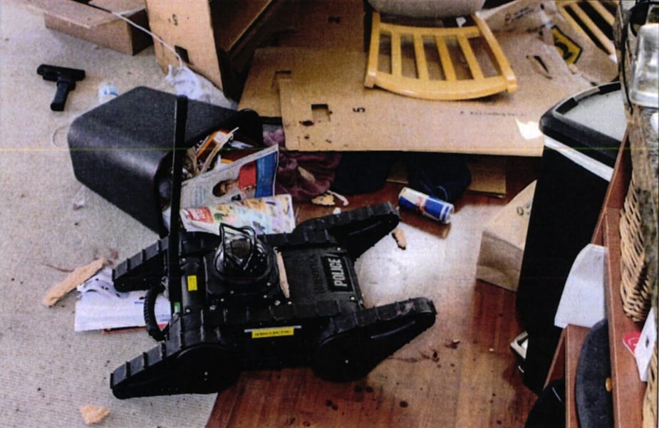 GUNBot Published Sunday, January 19, 2014 - 9:41 PM at 925 × 601 in Hearing on SPD shooting of Capitol Hill man begins Tuesday The robot used to check on Reuter after snipers shot him with Reuter’s gun at the top-left. (Image: SPD)