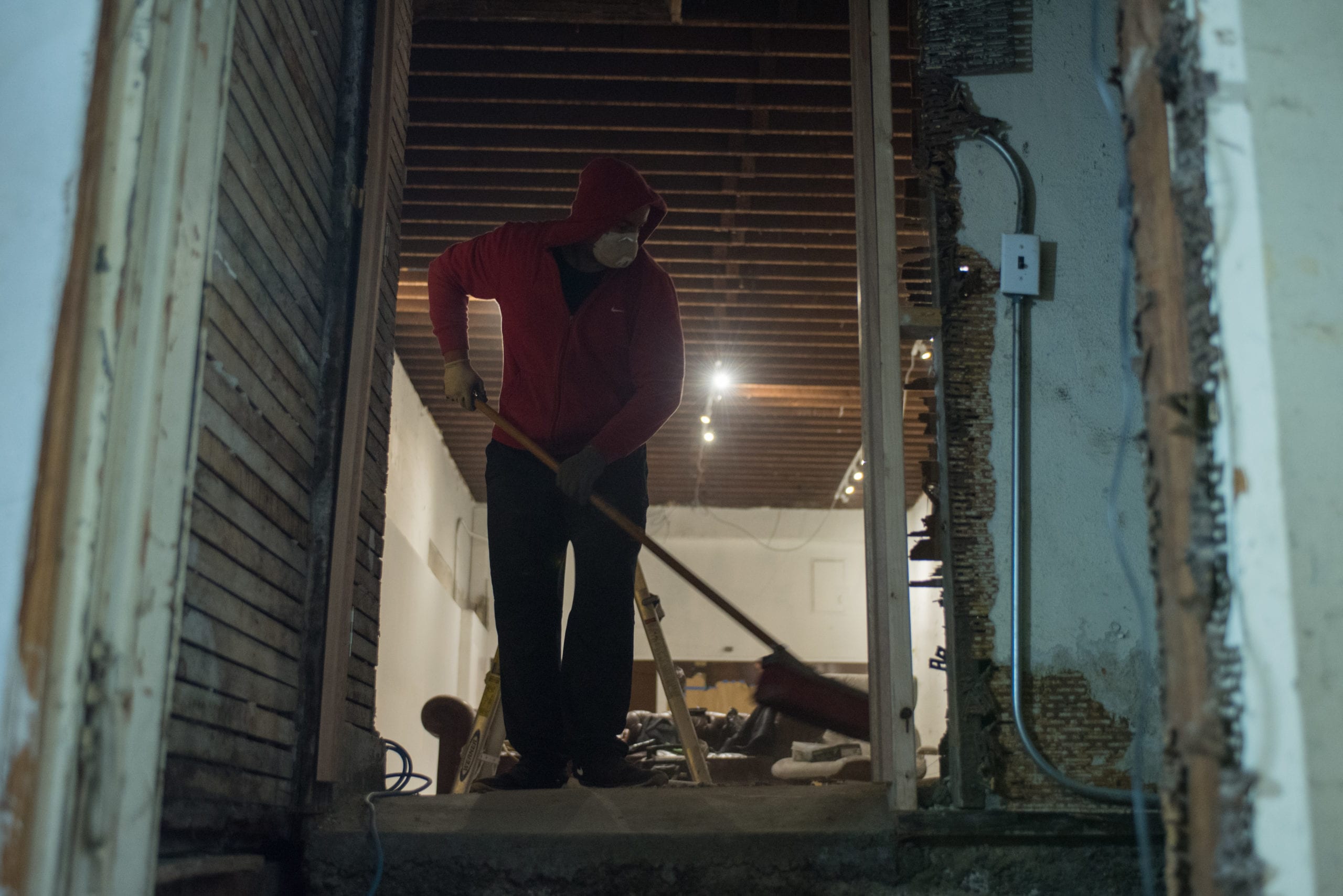 Zach Self sweeps away dust and dirt left from sanding the floor and pulling wood from the wall to this right, Wednesday Jan. 27th, 2016. Self is one of the core leaders of Lovecitylove and the only one amongst them with carpentry experience. Other members have been simply learning as they go along in renovating each space.
