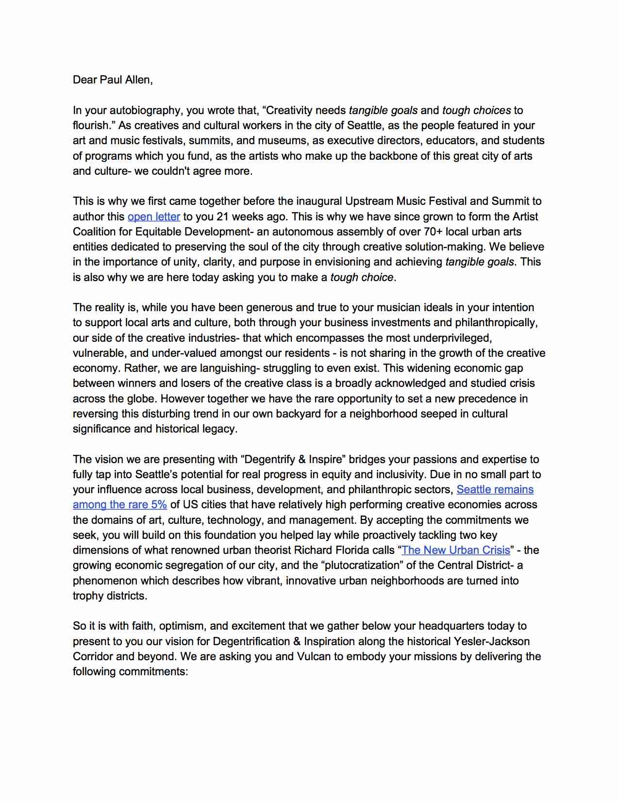 Open Letter To Allen Sept 19th Published Tuesday, September 19, 2017 - 8:17 AM at 1275 × 1650 in Capitol Hill Community Post | Youth, Artists Rally for Equity from Vulcan, Paul Allen
