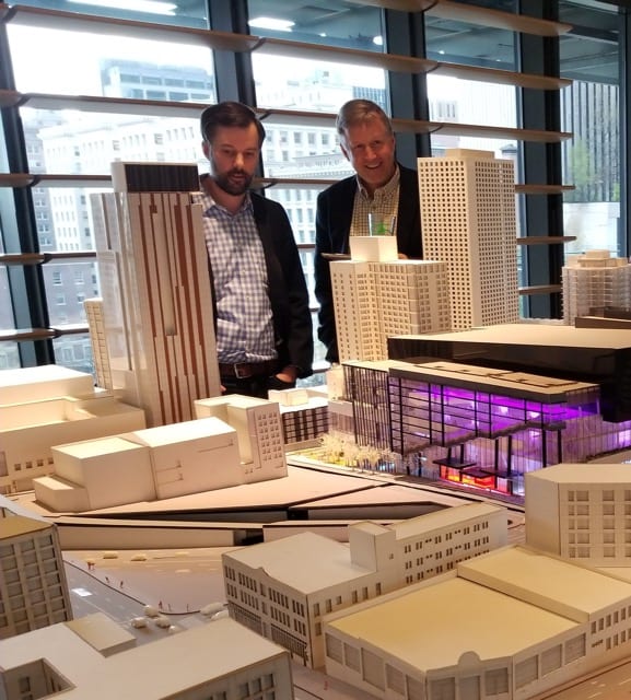 MikeOBrienlookingatconventionventermodel Published Thursday, April 19, 2018 - 8:58 AM at 577 × 640 in ‘Community Package’ including affordable housing, park cash gets support in Convention Center expansion hearing Council member Mike O’Brien (right) views a model of the planned convention center expansion (Image: CHS)