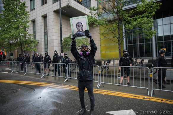 A Seattle protester holds a portrait of George Floyd in the days following his May 25th, 2020 killing