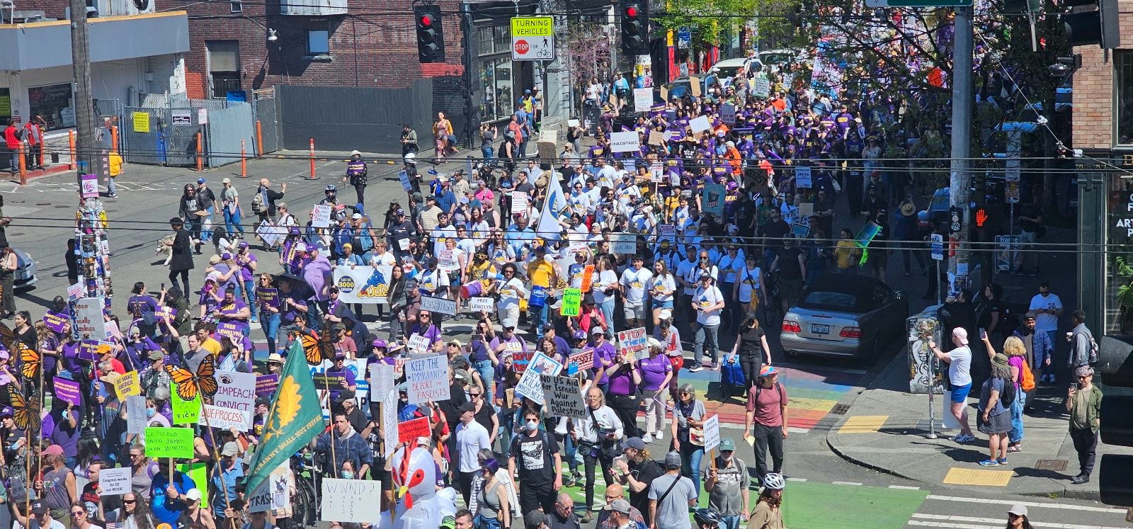 bafkreiendsnbuf3gxx4zcwm3zyufbdcnsztyo3zbebgpfrrksddq75lw2e Published Thursday, May 1, 2025 - 3:42 PM at 1600 × 747 in May Day 2025 in Seattle crosses Capitol Hill with rally, chants, and marching — UPDATE Seattle May Day crowds crossing Broadway Thursday afternoon (Image: CHS)